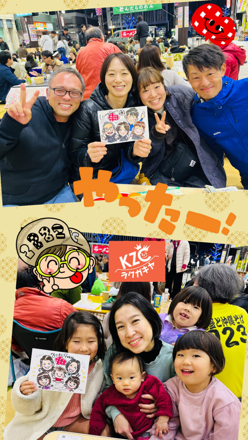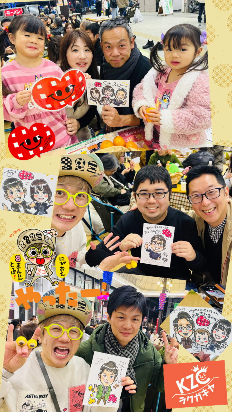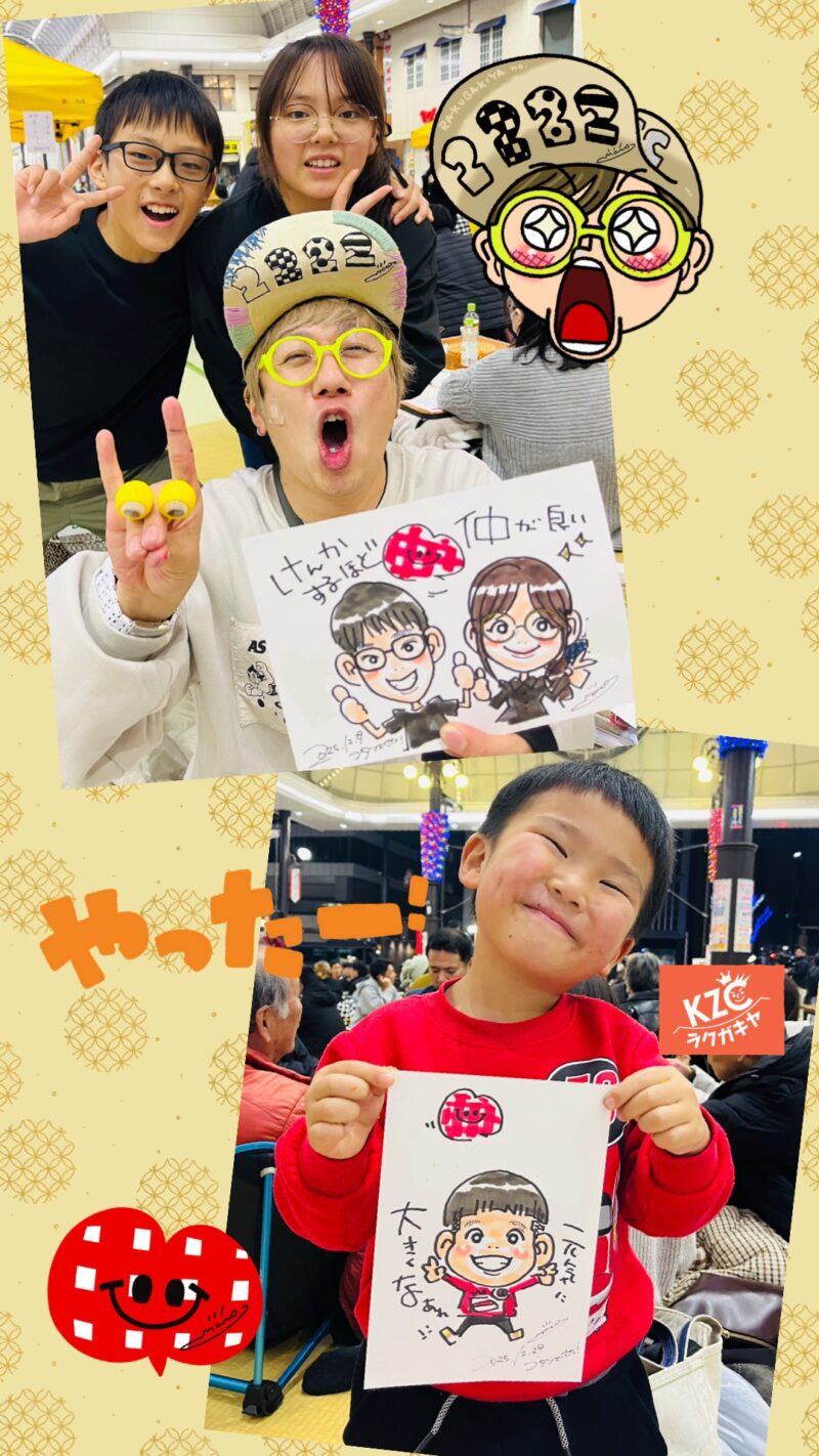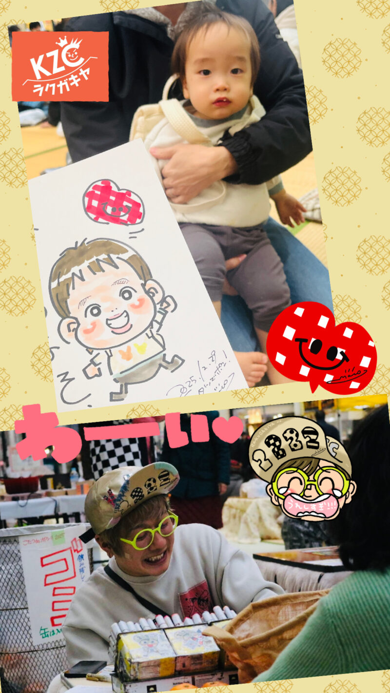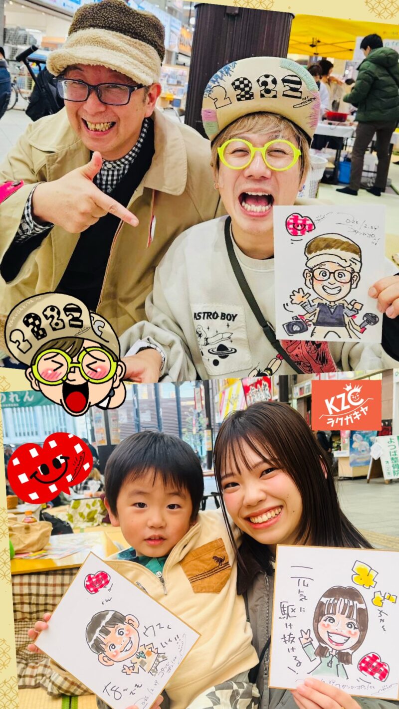県外から旅行で大分に来ていたカップルが、「昨年、楽しかったから今年も来ました!」って嬉しすぎる再来 大企業の社長さんが無邪気に似顔絵めちゃくちゃ喜んでくれたり、四人の子供をワンオペママさんが”ゴールという名のスタートだ”ってキャッチコピーの生みの親だったり、お絵描き大好き姉妹、歌で世界を目指す女の子、毎年似顔絵しに来てくれるご家族さま、ご依頼の絵から実際に会いに来てくれたご家族さま♡毎年にがおえ楽しみにしてくれるしょーの先生、かくさん、かよさん、ゆかさん…などなど感激の連発でした(*^u^*)ほくほく