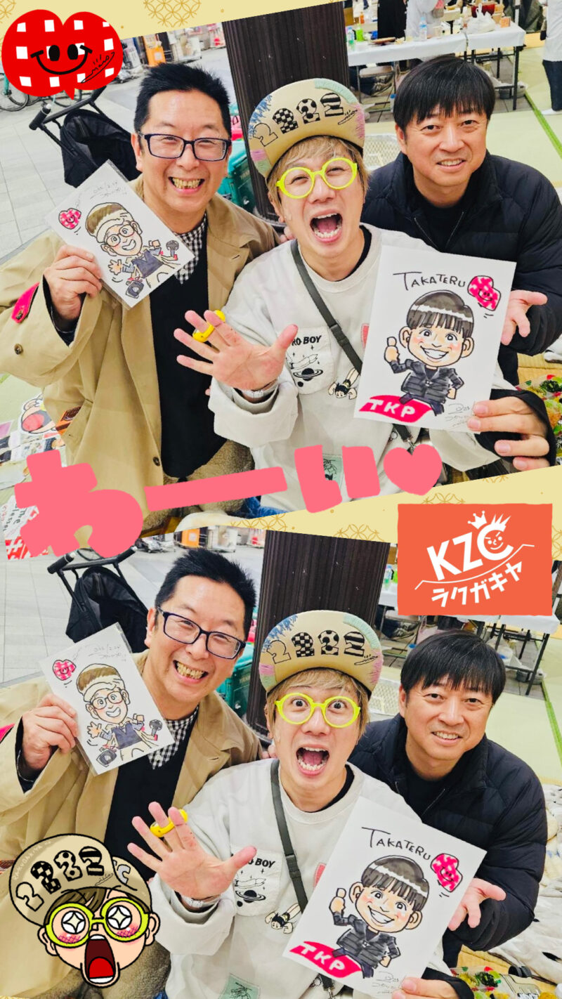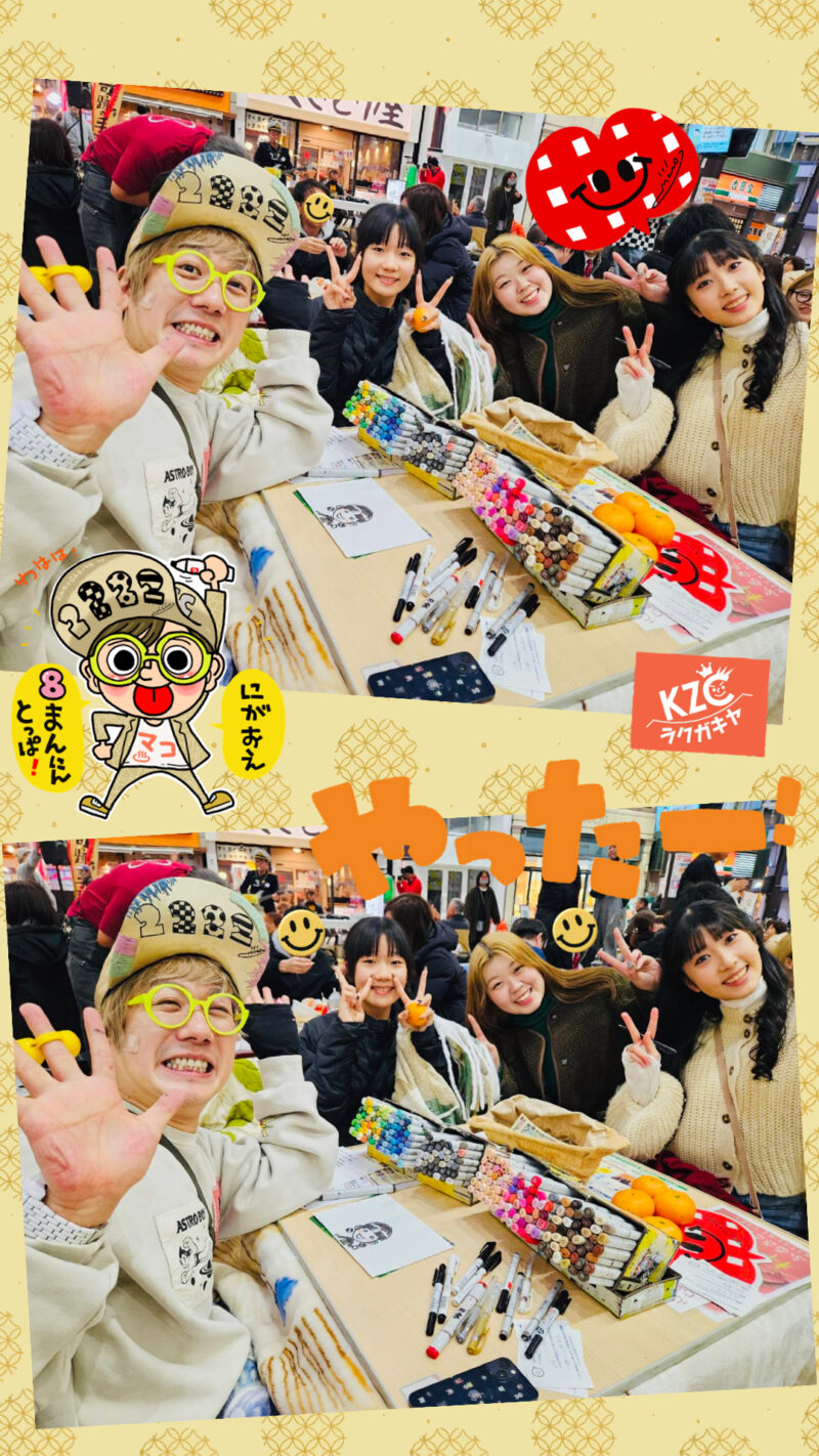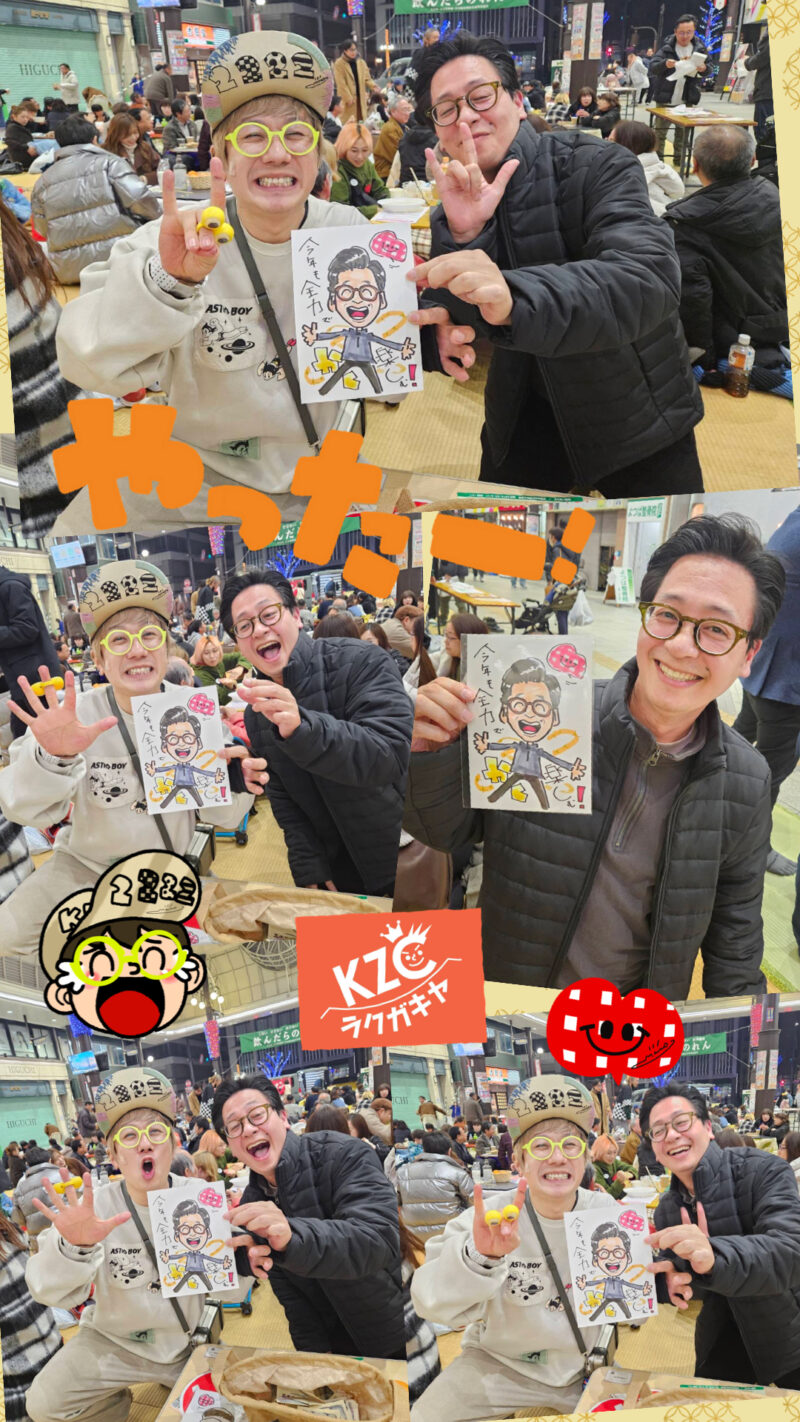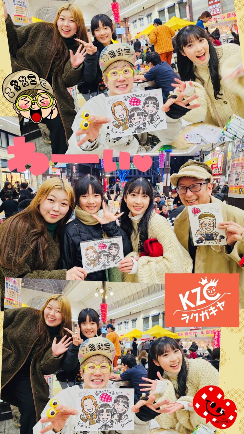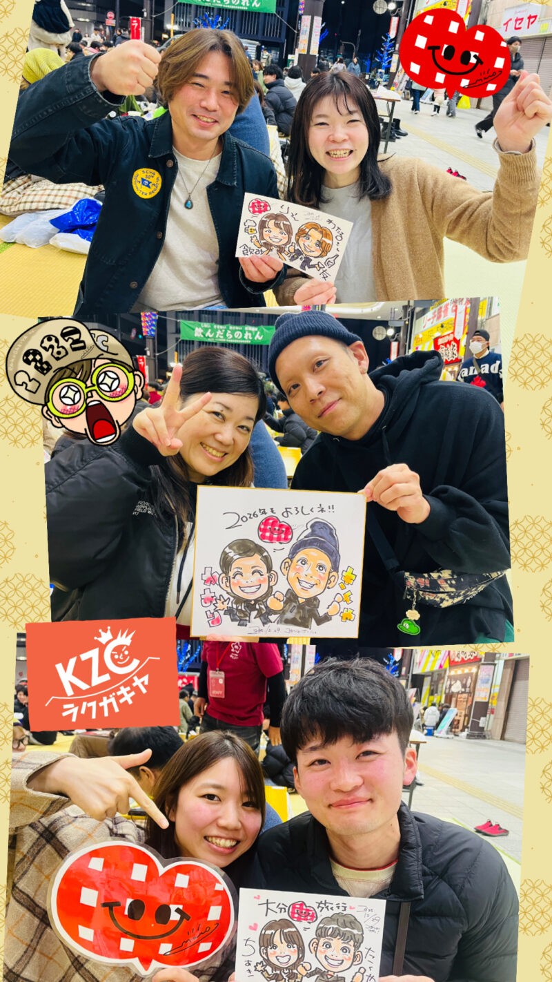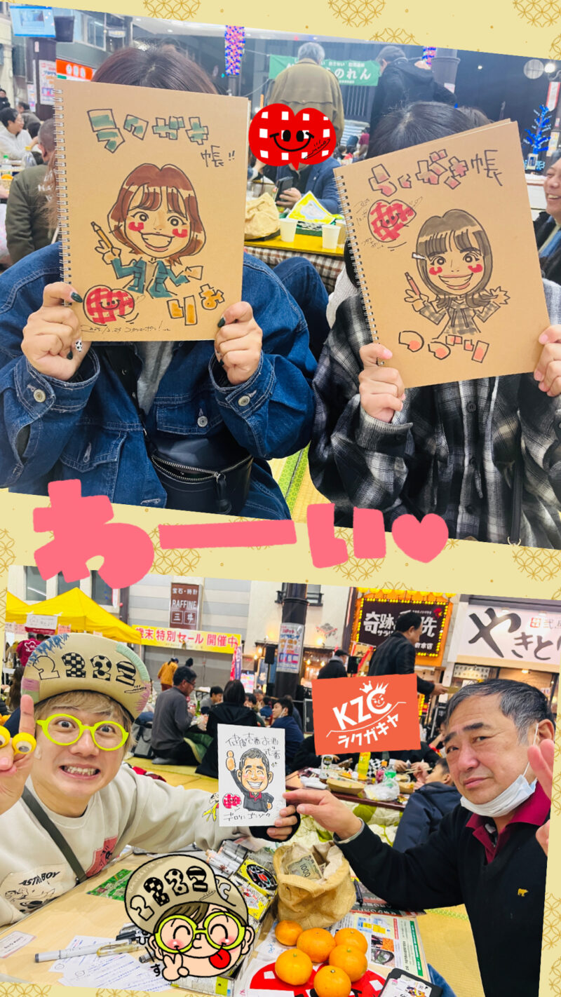 県外から旅行で大分に来ていたカップルが、「昨年、楽しかったから今年も来ました!」って嬉しすぎる再来 大企業の社長さんが無邪気に似顔絵めちゃくちゃ喜んでくれたり、四人の子供をワンオペママさんが”ゴールという名のスタートだ”ってキャッチコピーの生みの親だったり、お絵描き大好き姉妹、歌で世界を目指す女の子、毎年似顔絵しに来てくれるご家族さま、ご依頼の絵から実際に会いに来てくれたご家族さま♡毎年にがおえ楽しみにしてくれるしょーの先生、かくさん、かよさん、ゆかさん…などなど感激の連発でした(*^u^*)ほくほく