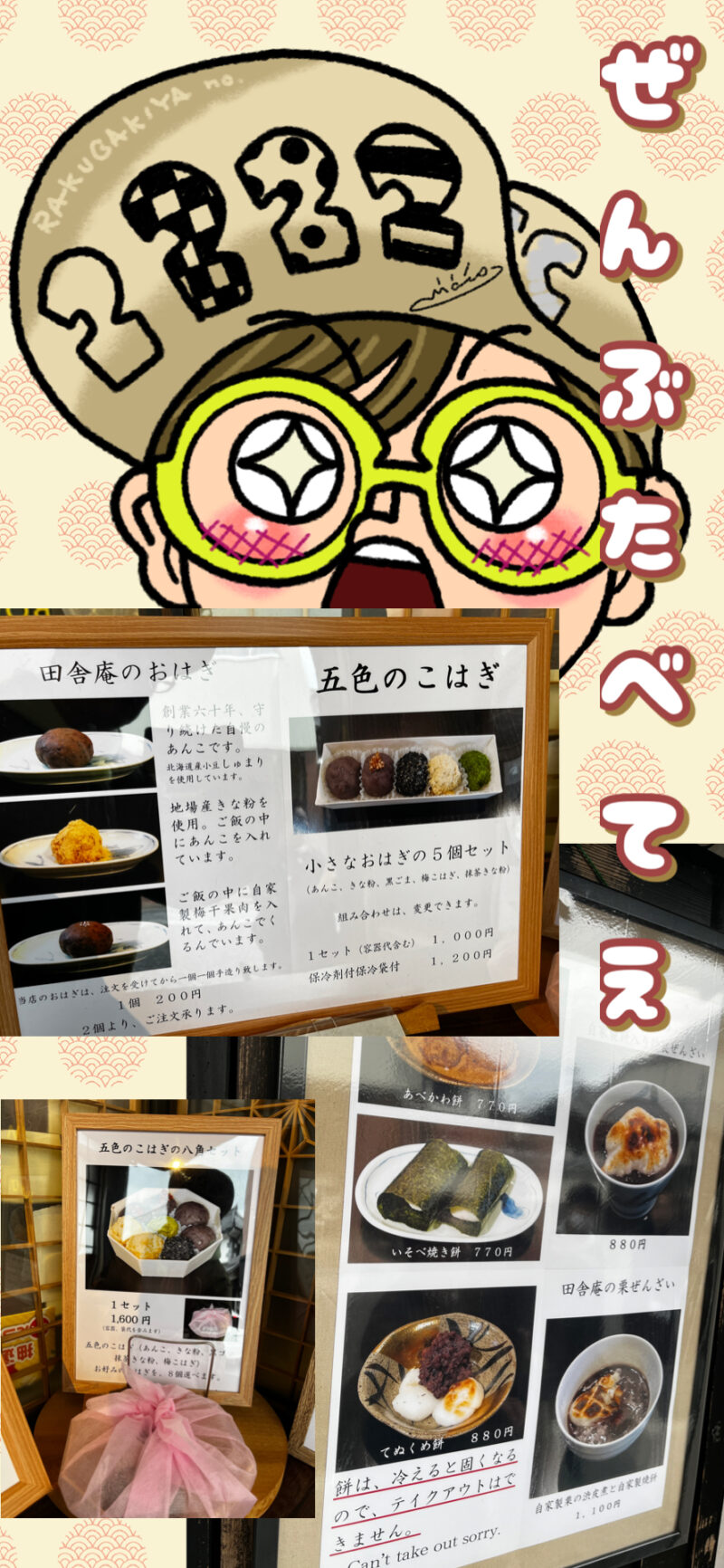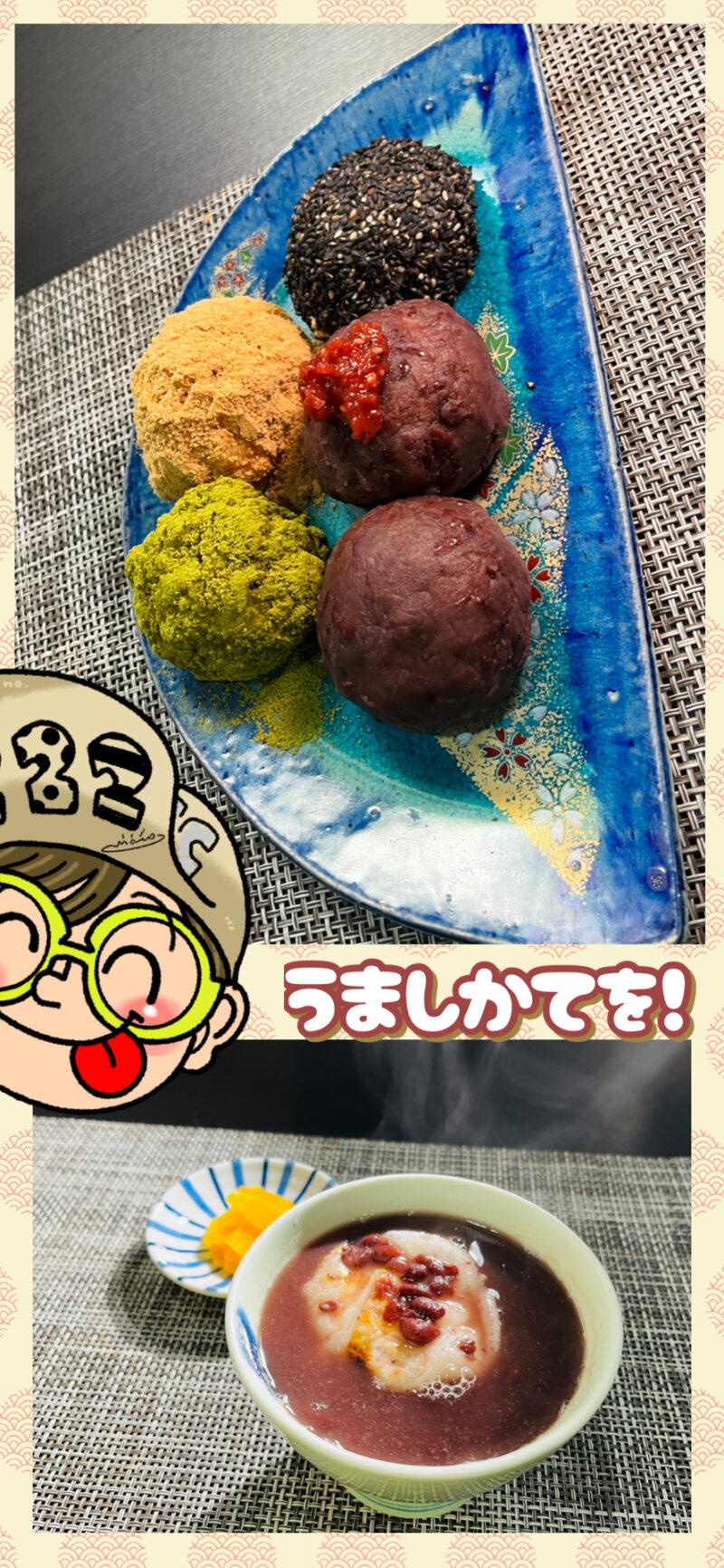 ディレクターが好きなの頼んで良いというので、5色のこはぎ と ぜんざいを選びました!